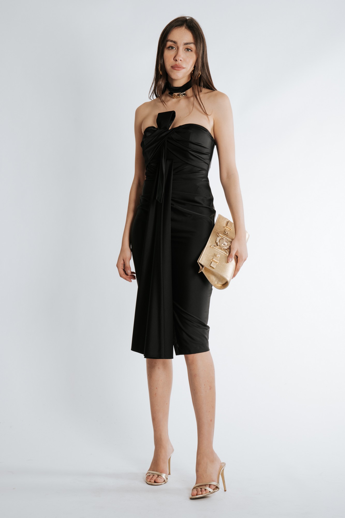 MIDI DRESS DRAPED WITH CHOKER AND ZIP IN THE CENTER BACK 80% POLYAMIDE + 20% ELASTANE MADE IN ITALY