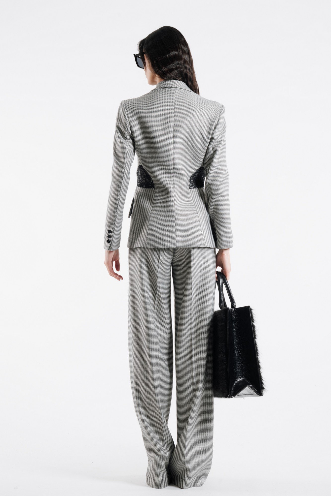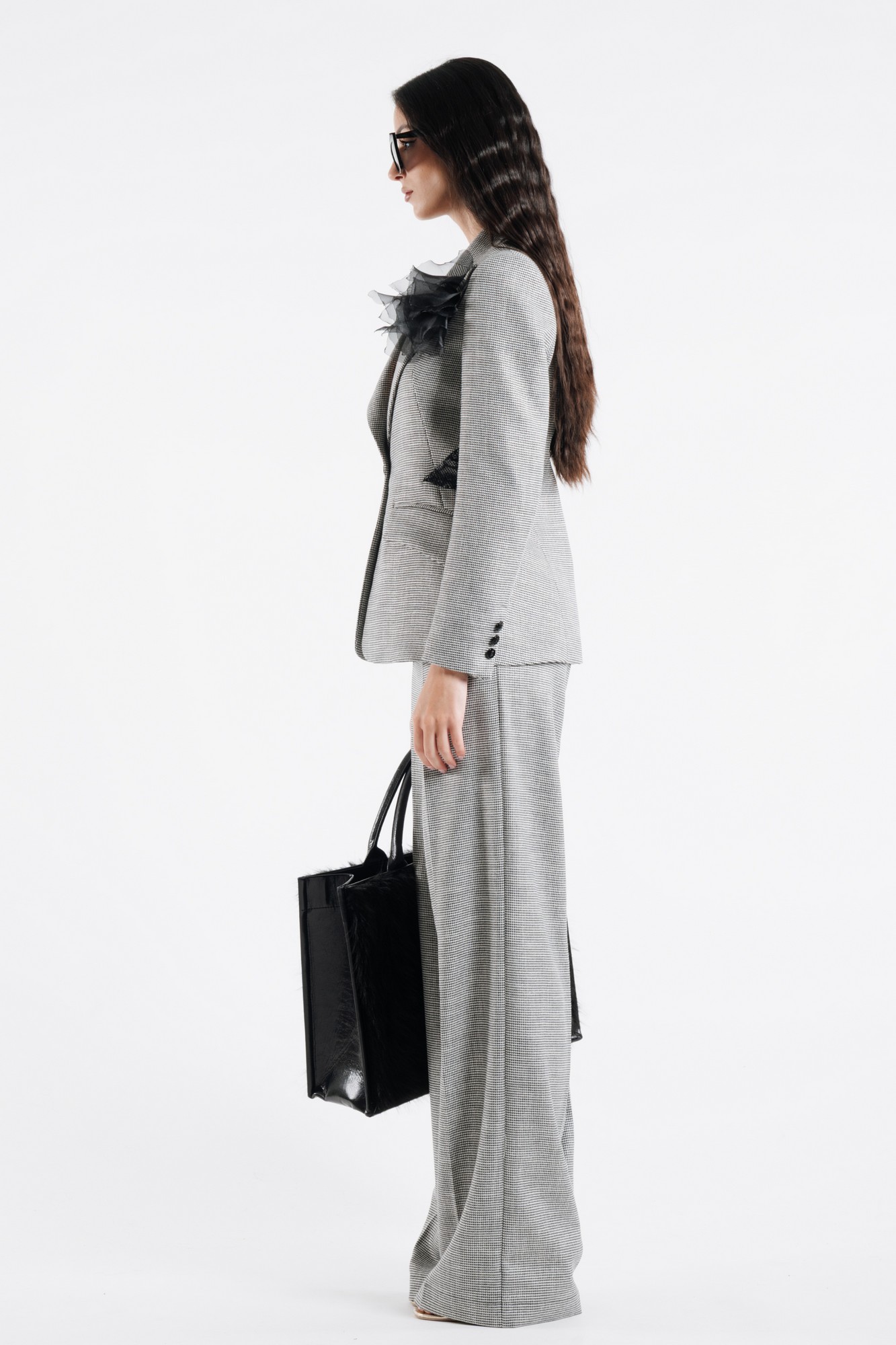PANTS $280 JACKET $428 SINGLE-BREASTED HOUNDSTOOTH BLAZER WITH REMOVABLE ORGANZA FLOWER 53% POLYAMIDE + 44% VISCOSE + 3% ELASTANE 68% VISCOSE + 32% ACETATE MADE IN ITALY